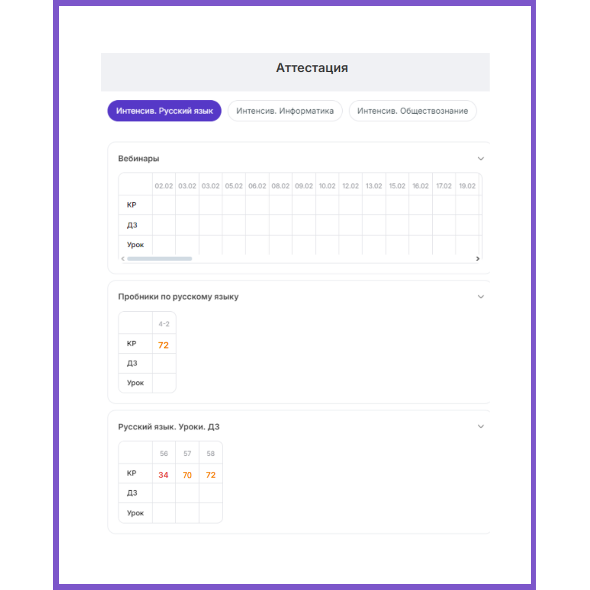 У ученика есть личный кабинет с расписанием вебинаров, уроков, пробников и дневником прогресса. Родителю также доступен свой личный кабинет, где можно следить за успеваемость и прогрессом обучения ребенка