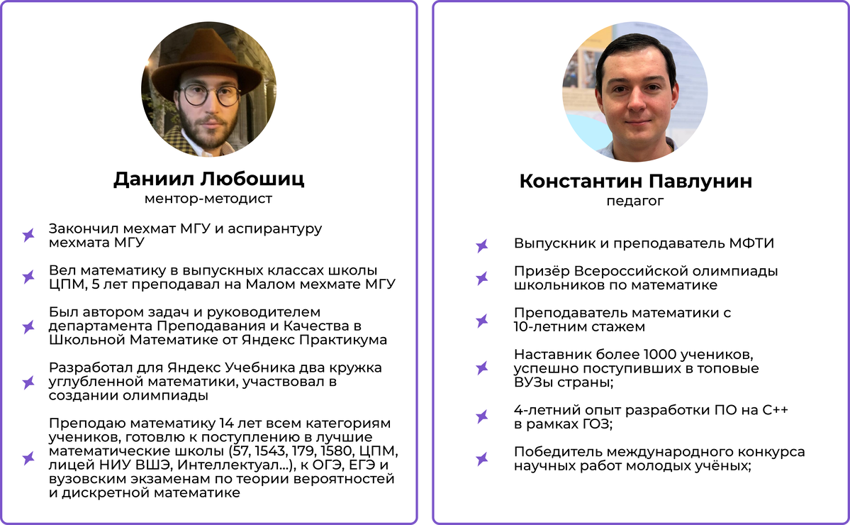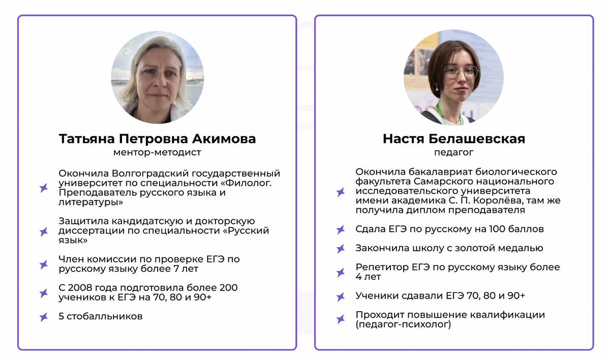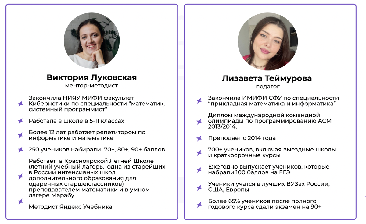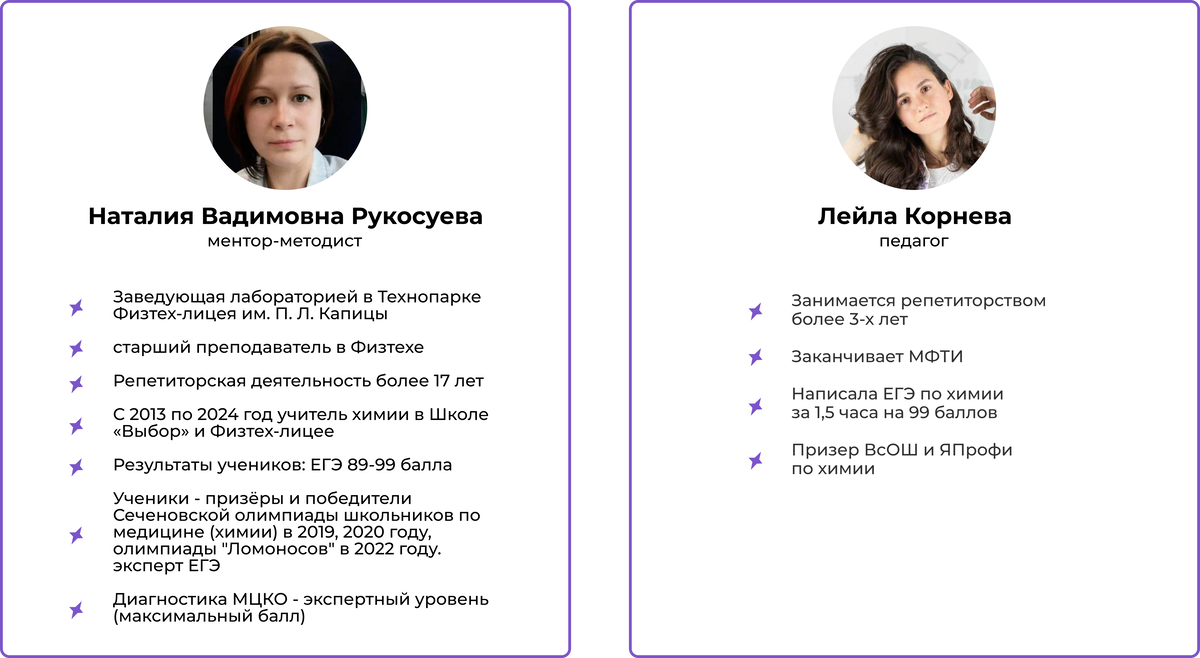 Наша особенность — это образовательная пара из методиста и педагога. Методист обладает опытом составления эффективных программ подготовки к ЕГЭ на 80+ баллов, а молодой (но также опытный в плане подготовки) педагог помогает выстроить доверительные отношения с ребенком и “влюбить в предмет” (наши педагоги еще и действующие научные сотрудники — например, сотрудники лабораторий химии, физики, биологии).